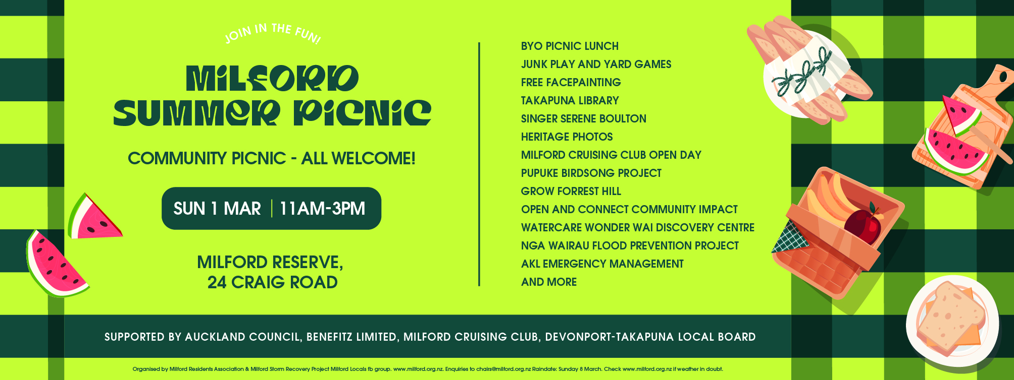 We look forward to seeing you at our 2026 Milford Summer Picnic. Sunday, 1 March 2026, 11am to 3pm, Milford Reserve.